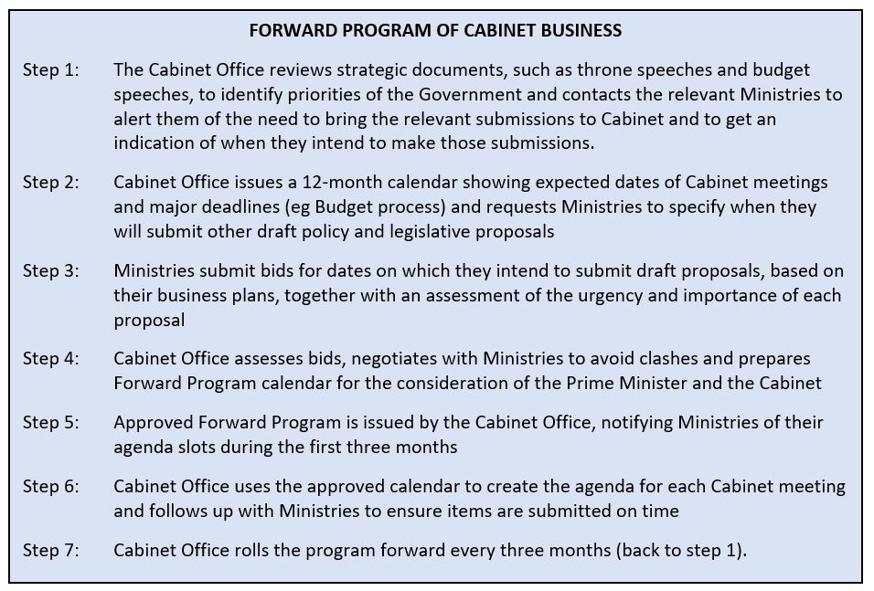 The Forward Program is essentially a rolling 12-month calendar of Cabinet meetings, showing when key policy and legislative proposals will be considered. The first three months are detailed, with an outline of the business for the remaining nine months. The program will incorporate the process for Cabinet consideration of budget proposals and include the deadlines for finalization of the Government’s legislation program for each sitting of the Parliament.